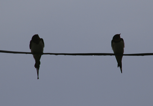 パパが電線で羽繕いをしながら休憩しているところにママが帰宅